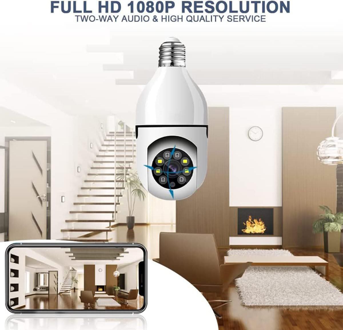 CARACTERÍSTICAS PRINCIPALES: ✅ Vigilancia discreta integrada en un foco LED. ✅ Vista panorámica de 360 grados sin puntos ciegos. ✅ Conexión WiFi para monitoreo y control remoto desde el móvil. ESPECIFICACIONES TÉCNICAS: 🎥 Resolución: Full HD (1080p). 🌐 Conectividad: WiFi (soporta app móvil). 💡 Instalación: Rosca E27 estándar (como un foco normal). BENEFICIOS: 🌟 Seguridad total del hogar con instalación simple. 💖 Detección de movimiento y notificaciones instantáneas.
