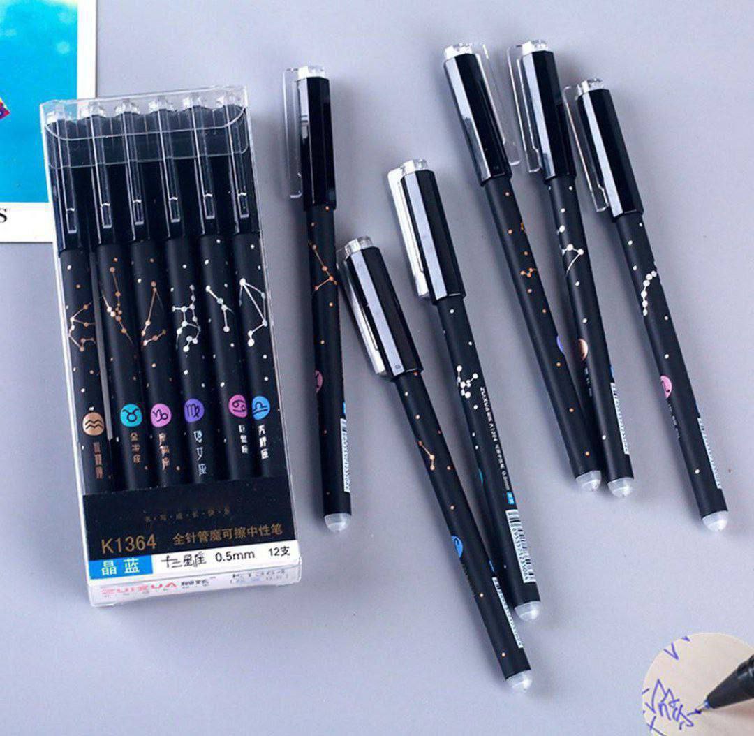 CARACTERÍSTICAS PRINCIPALES: ✅ Tinta de gel de colores, borrable mediante fricción (sin necesidad de corrector). ✅ Set completo con los 12 signos del zodiaco. ✅ Escritura suave y cómoda. ESPECIFICACIONES TÉCNICAS: 🖊️ Cantidad: 12 unidades. ✍️ Tipo de Tinta: Gel borrable por calor. 🌟 Diseño: Zodiacal. BENEFICIOS: 🌟 Permite corregir errores sin estropear el papel. 💖 Ideal para estudiantes o como un regalo temático original.